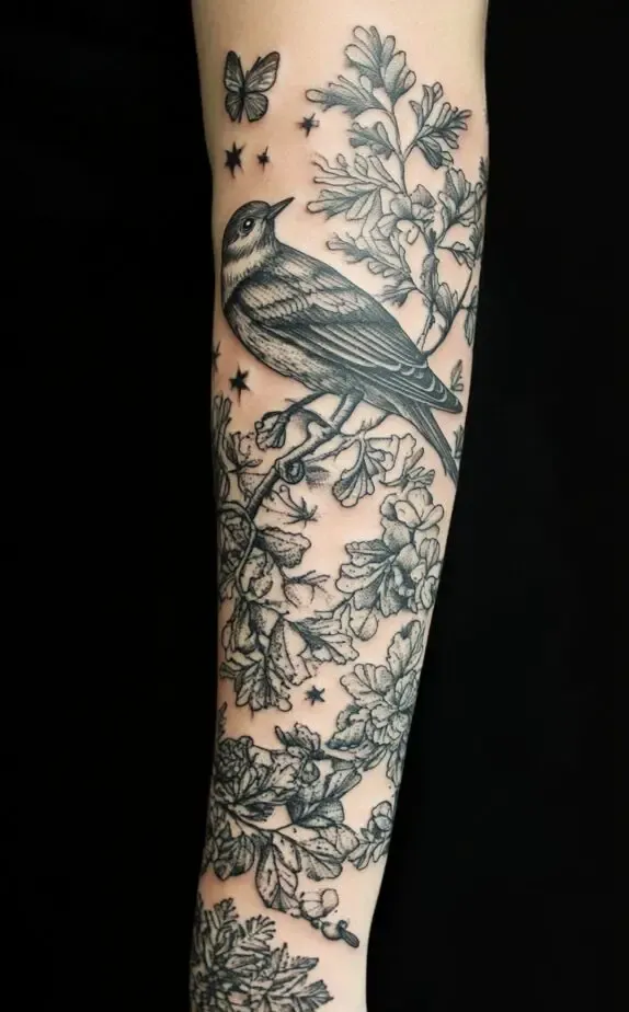 In this design, a detailed bird sits amidst branches adorned with butterfly motifs and tiny stars, creating a dreamy, ethereal look. The contrast between the structured bird and the whimsical butterflies adds depth, giving the tattoo a balanced aesthetic. This piece is perfect for someone who enjoys intricate, storybook-inspired art.