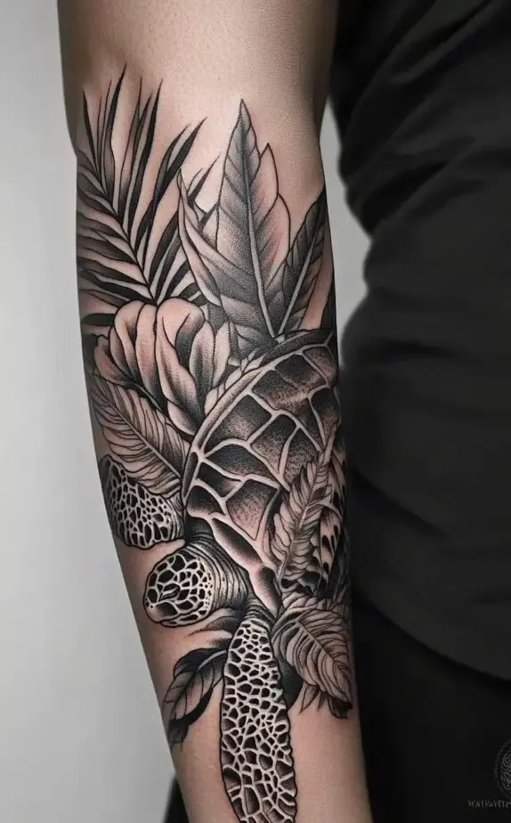 A unique design featuring a turtle nestled among tropical leaves and flowers, this tattoo brings together nature and marine life. The turtle represents wisdom, protection, and endurance, while the surrounding foliage adds an earthy, calming element. The shading enhances the turtle s shell details, making it a standout feature.