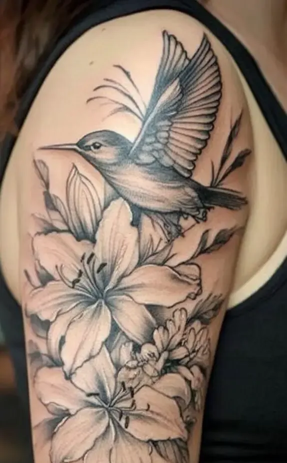 This design features a hummingbird hovering over a cluster of beautifully detailed flowers. The bird s wings are captured mid-flap, symbolizing freedom, grace, and lightness. The intricate detailing on both the hummingbird and flowers brings a lifelike quality to the tattoo, making it appear almost three-dimensional.