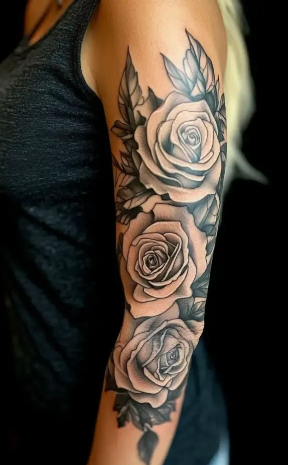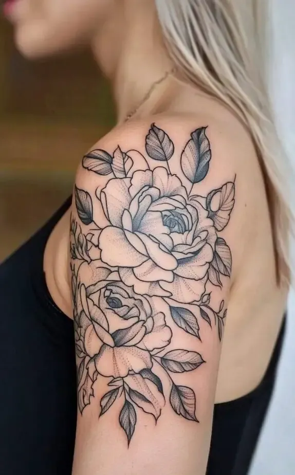 This tattoo features a bouquet of roses cascading across the shoulder and upper arm, symbolizing love, beauty, and passion. The fine line work and subtle shading add a sense of realism, while the roses arrangement gives the tattoo a sense of movement, almost as if the flowers are gently growing up the arm.
