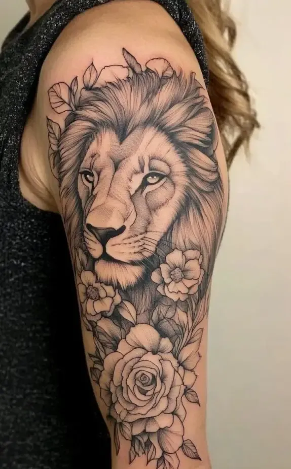 A majestic lion surrounded by roses captures both strength and beauty in this design. The fine lines and intricate details in the lion s mane are softened by the surrounding roses, creating a balance between power and grace. This tattoo is ideal for someone who identifies with the lion s symbolism of courage and leadership.