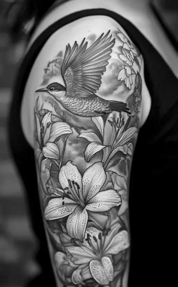 Hummingbirds are often seen as symbols of resilience and adaptability, making this tattoo a meaningful choice for those who value strength and beauty. The contrast between the bird and the blooms creates a dynamic look, adding elegance and charm to this half-sleeve piece.
