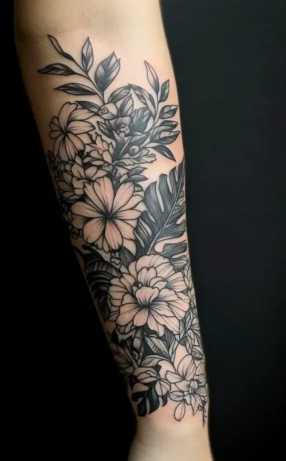This design is ideal for those who want a tattoo that embodies relaxation and island vibes. The flow of the flowers down the arm gives it a cohesive look, perfect for someone seeking an exotic yet elegant piece.