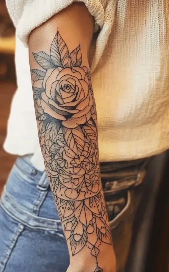 This tattoo combines the elegance of a rose with intricate mandala patterns for a balanced, symmetrical design. The rose stands out with bold outlines, while the mandala adds a layer of complexity, symbolizing unity and harmony. The black ink contrasts beautifully with the negative space, enhancing the tattoo s overall depth.