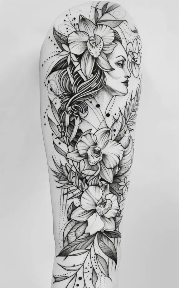 Popular designs include floral arrangements, mandalas, delicate line work, and even abstract patterns, each adding a refined touch to any look. Classy half-sleeve tattoos allow women to explore meaningful symbols, intricate patterns, or minimalist beauty while maintaining a timeless appeal, making these tattoos a beautiful choice for those seeking both style and personal expression.