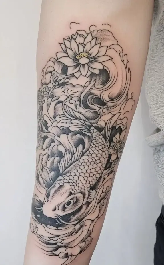 The flowing water and gentle shading bring movement to this piece, while the carefully detailed scales and petals highlight the artist s skill. This tattoo s balance of soft curves and sharp details makes it an ideal choice for anyone seeking a visually stunning and meaningful half-sleeve.
