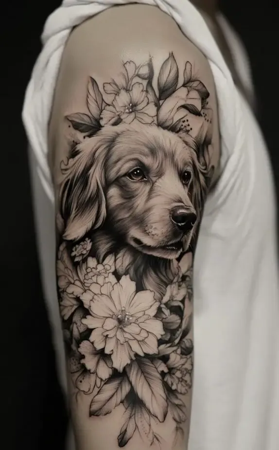 This tattoo is ideal for pet lovers who want a lasting tribute to their furry friends. The combination of floral elements with the dog s portrait adds a sense of love and loyalty, making it a deeply personal and classy design.