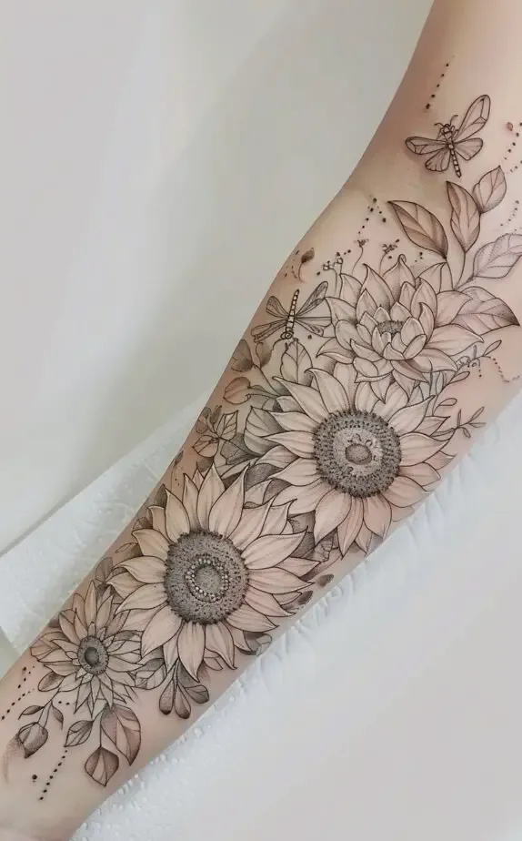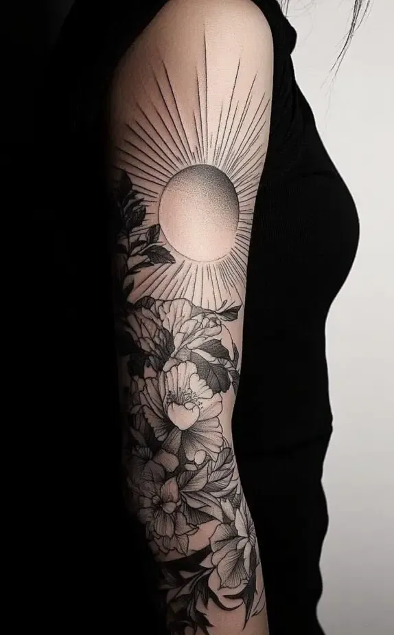 Ideal for someone who values both beauty and symbolism, this tattoo represents new beginnings and optimism. It s a radiant design that adds a sense of brightness and positivity, perfect for a classy and meaningful half-sleeve tattoo.