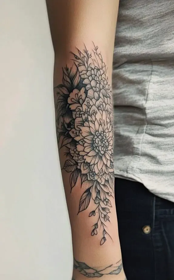 The use of various floral species adds visual interest and symbolizes a variety of meanings, from love and hope to strength and resilience. This tattoo embodies a gentle beauty that s ideal for those seeking a minimalist yet profound piece.