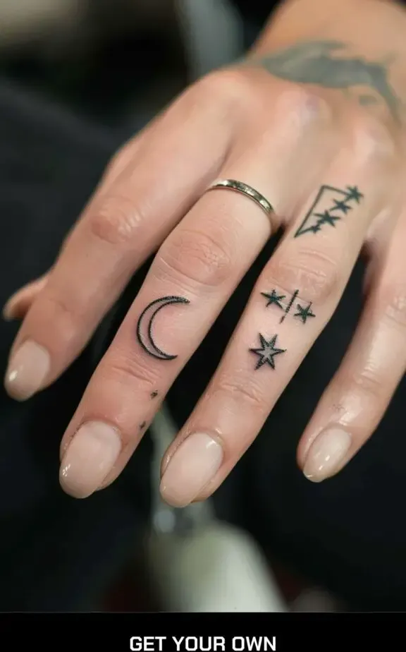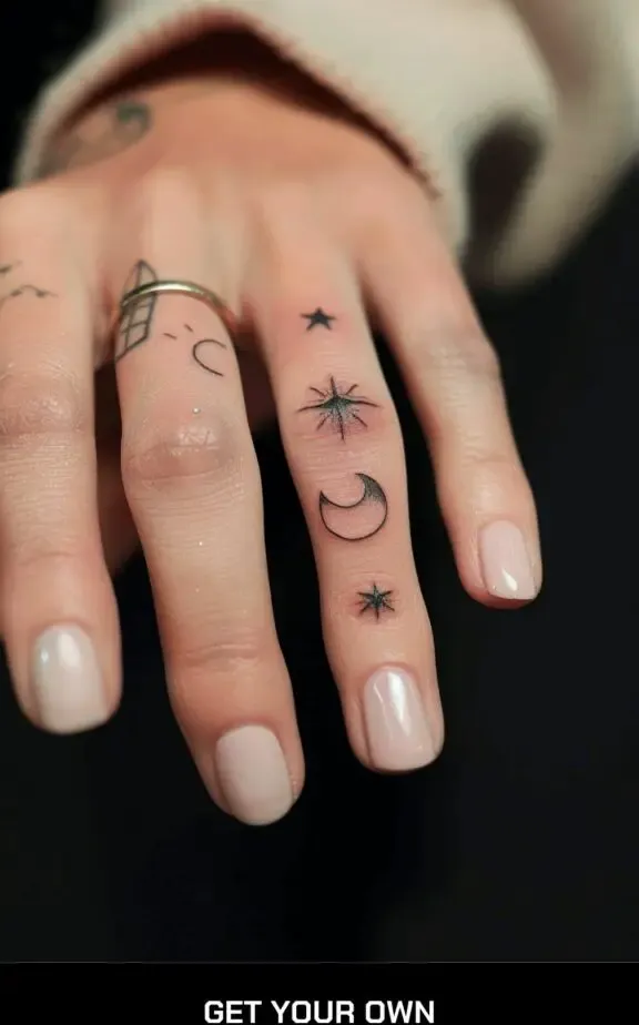 Celestial designs like stars, moons, and constellations create a dreamy and whimsical look. These tattoos can be arranged creatively across the fingers.
