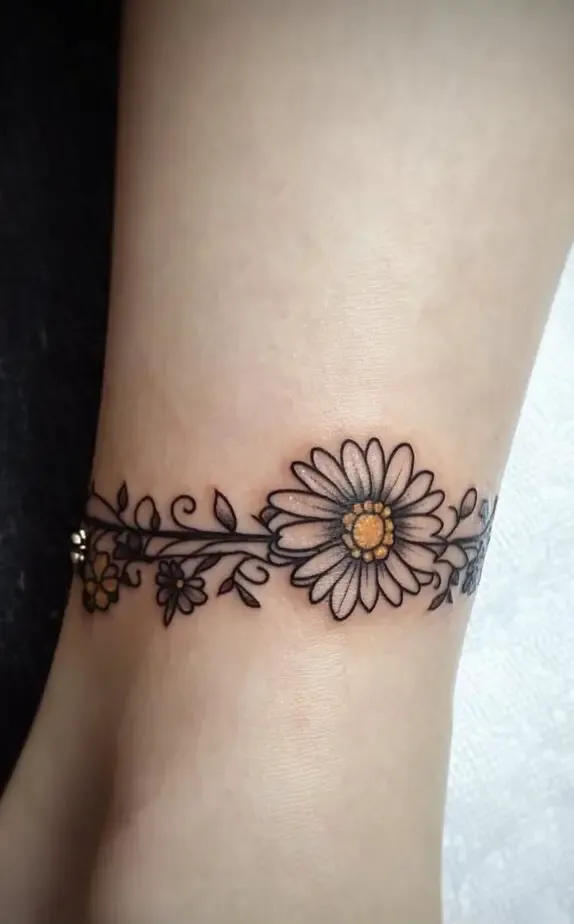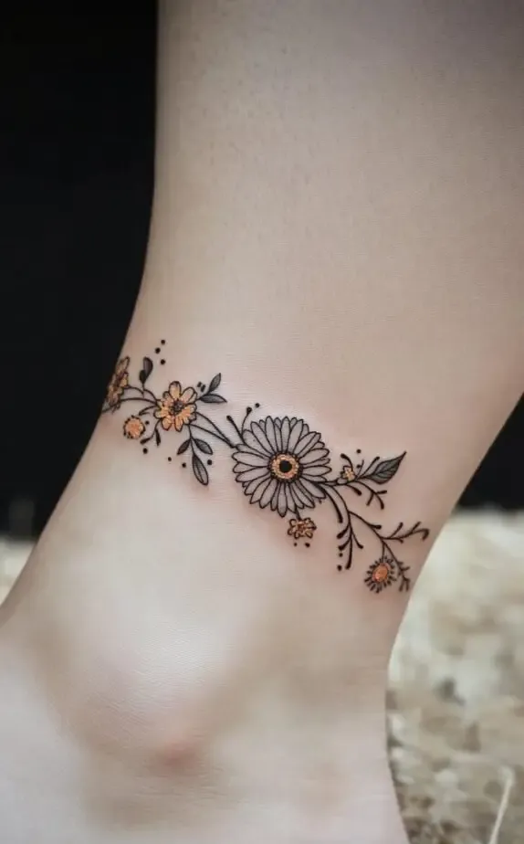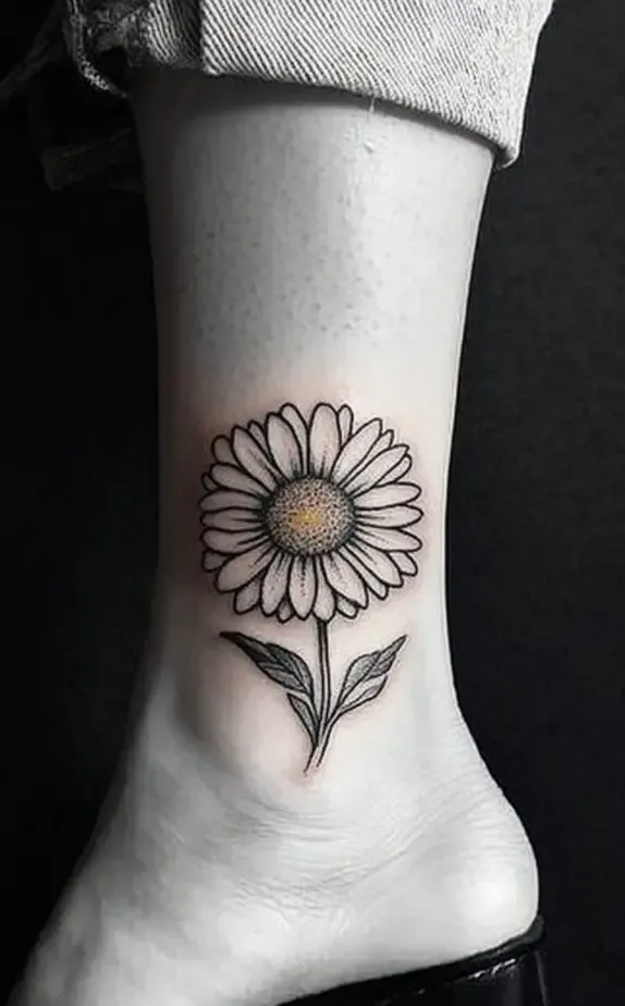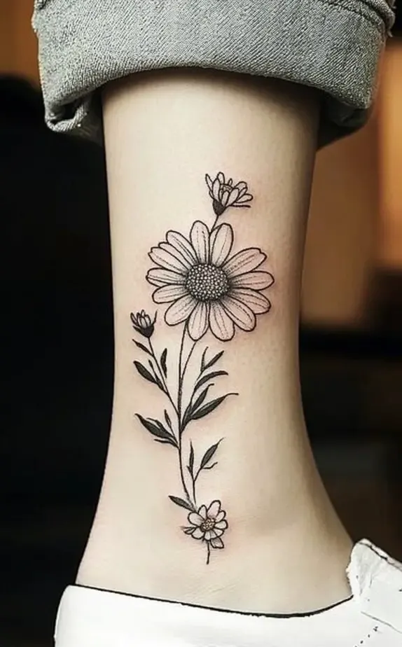 Daisies are simple, elegant flowers that carry meanings of innocence, purity, and new beginnings. A daisy ankle tattoo is a subtle and delicate design that reflects simplicity and grace. Daisies are often chosen for their association with childhood memories, nostalgia, and a carefree spirit.