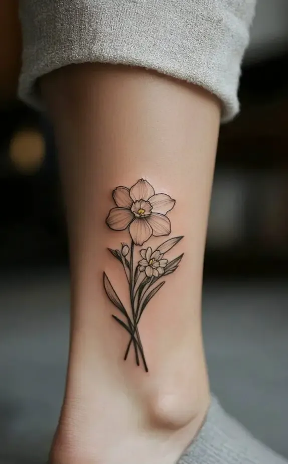 Marigolds are bright, bold flowers that symbolize passion, creativity, and positive energy. They are often associated with celebrations and vibrant life events. A marigold ankle tattoo is perfect for someone who is full of life and creativity, and who wants their tattoo to reflect their energetic personality.
