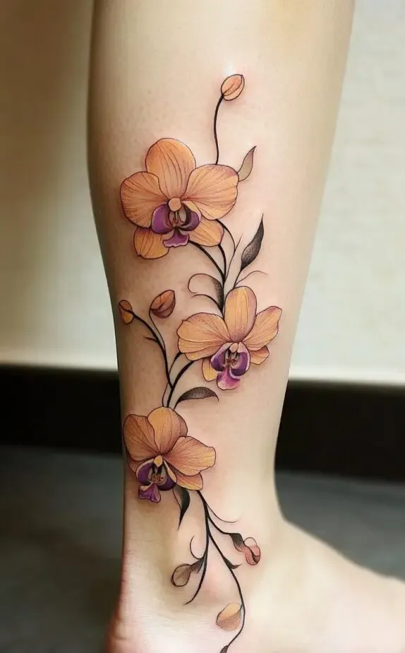 Flower ankle tattoos can be oriented in different ways to suit the natural shape of the ankle. Some designs flow vertically along the leg, while others wrap around the ankle horizontally. The orientation can affect the overall aesthetic and how the tattoo interacts with movement.