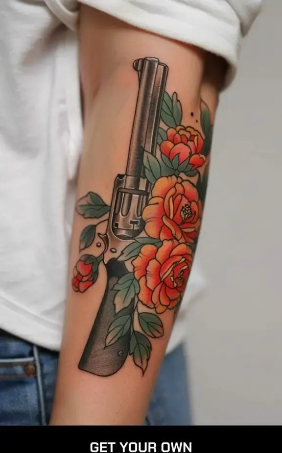 Combining a gun with flowers represents a juxtaposition of strength and beauty. This tattoo can be both edgy and delicate, making a unique statement.
