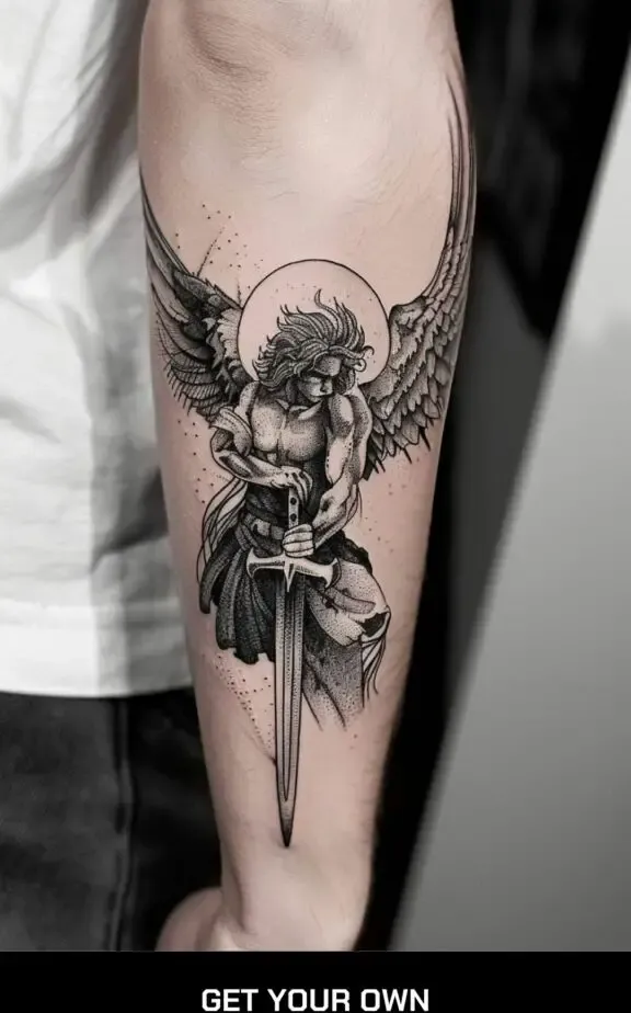 A warrior angel tattoo represents protection and strength. This design can be highly detailed, featuring armor, wings, and a determined expression.