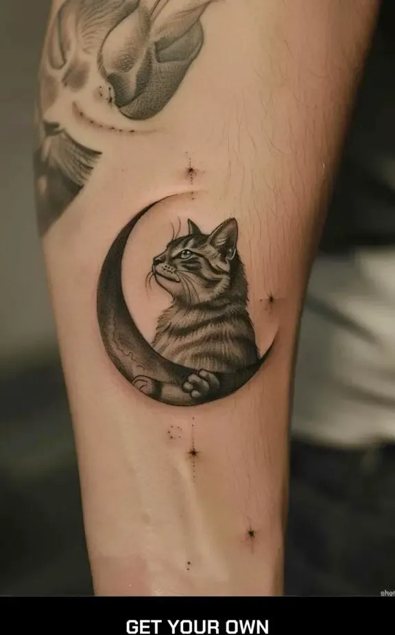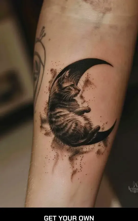 A cat with a crescent moon is a whimsical and mystical design. It represents independence and mystery, making a charming addition to the forearm.