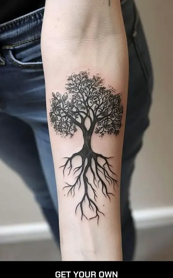 A tree with visible roots symbolizes growth and grounding. This design can be intricate, showing the connection between above and below ground.