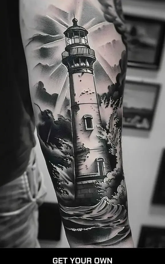 Lighthouses symbolize guidance and hope. A lighthouse tattoo can be paired with waves and clouds to create a serene and inspirational design.