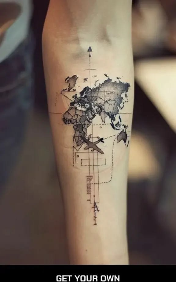 For the adventurous soul, a world map and airplane tattoo represents a love for travel and exploration. This design can be minimalist or detailed, depending on personal preference.