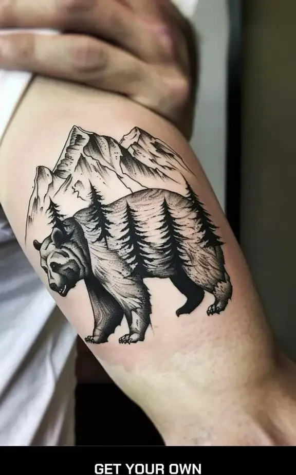 A bear tattoo surrounded by a nature scene represents strength, bravery, and a deep connection to nature. The forearm is an ideal spot to depict a detailed wilderness landscape.