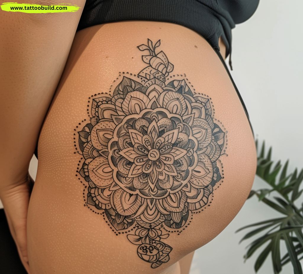 • A detailed mandala radiating from the hip bone.