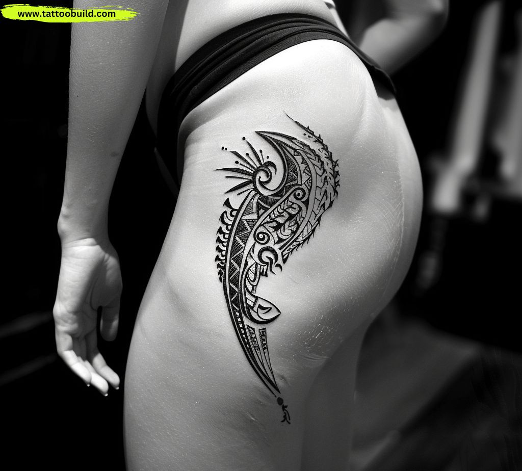 • Polynesian tribal patterns wrapping around the hip.