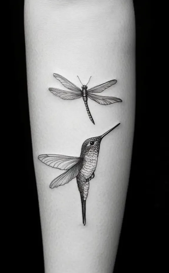 The intricate details of both creatures make this tattoo an excellent choice for minimalist art enthusiasts. The black-and-white style ensures that the focus remains on the graceful forms of the hummingbird and dragonfly.