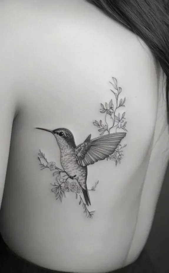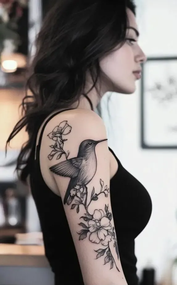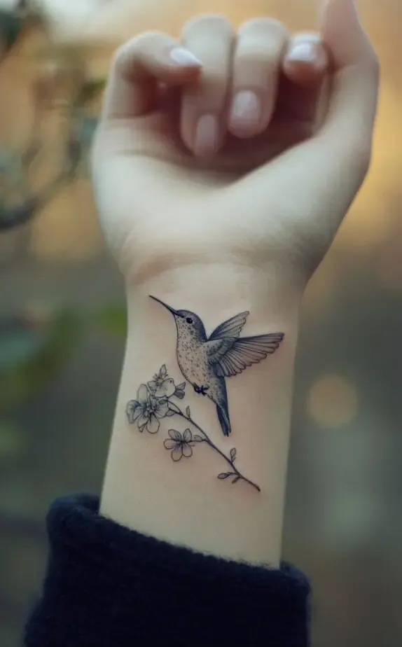 A hummingbird paired with delicate blossoms is a graceful and feminine design.