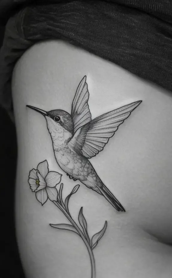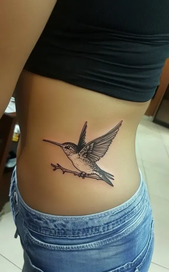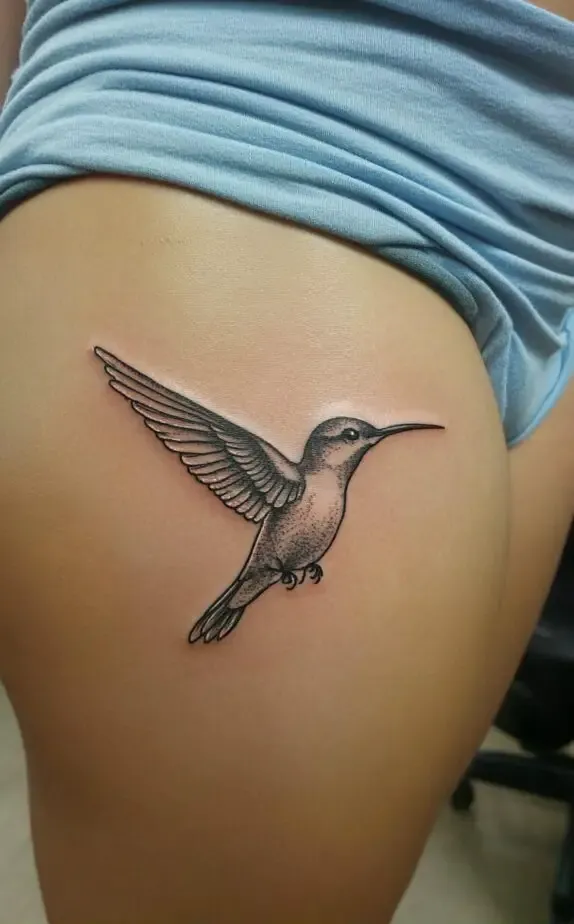 This delicate hummingbird design on the hip is subtle yet impactful, offering a perfect blend of elegance and charm.