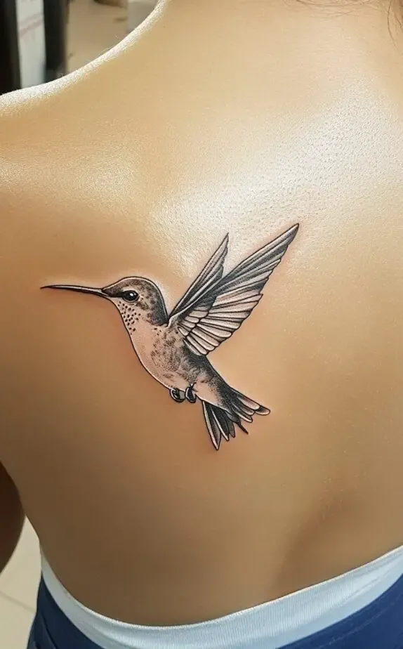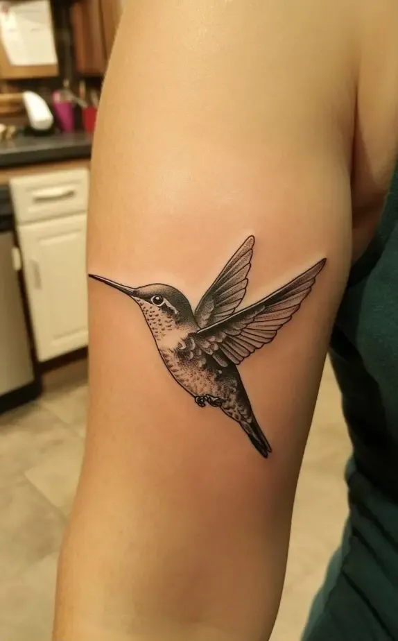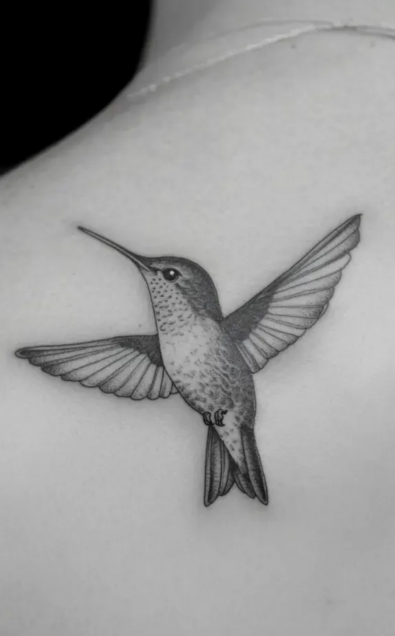 This shoulder design highlights a beautifully detailed hummingbird, perfect for women seeking a sophisticated yet simple tattoo.
