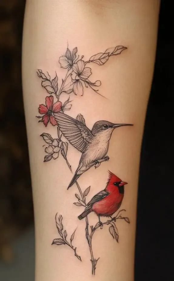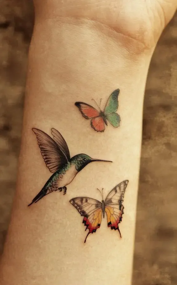 A hummingbird tattoo can be combined with other symbols to create a design that represents multiple aspects of your personality or experiences. For instance, pairing a hummingbird with a butterfly could symbolize transformation, while combining it with a tree might represent growth and stability.