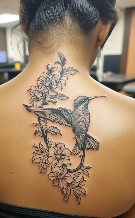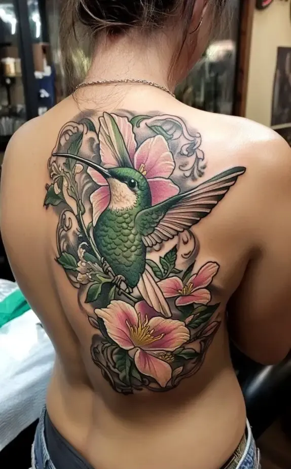 This large back tattoo features a vibrant hummingbird surrounded by lush flowers, creating a breathtaking masterpiece.