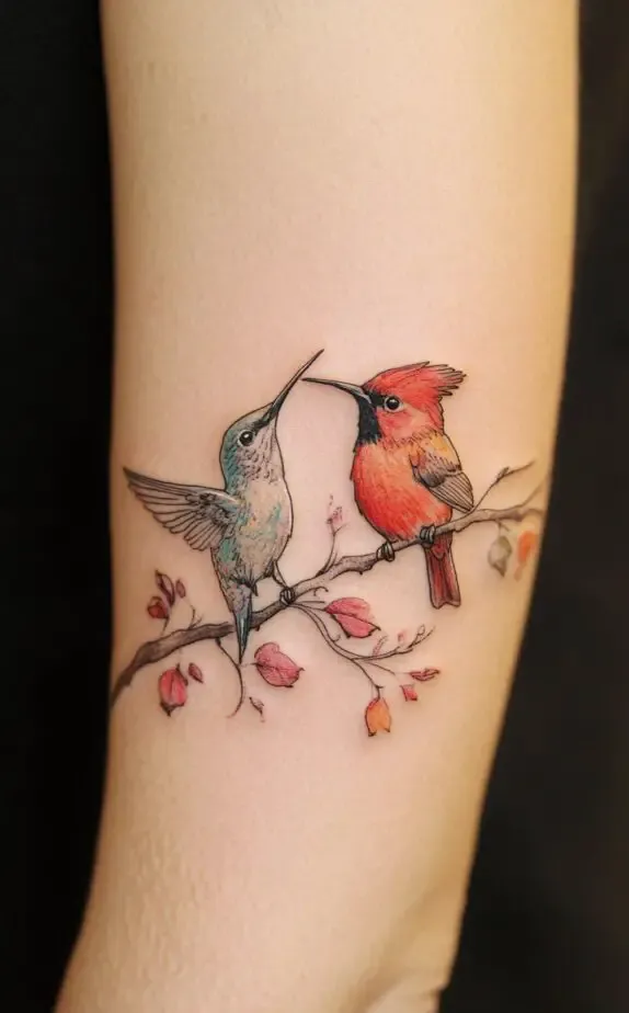 This tattoo showcases two birds perched on a branch, symbolizing connection and harmony.