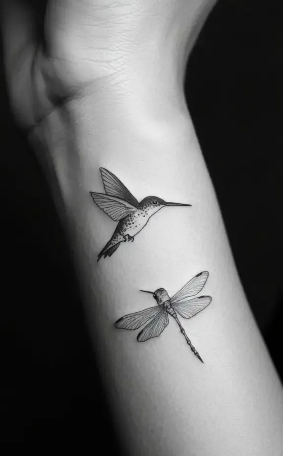 This design features a hummingbird and a dragonfly in a delicate balance, symbolizing transformation and adaptability.