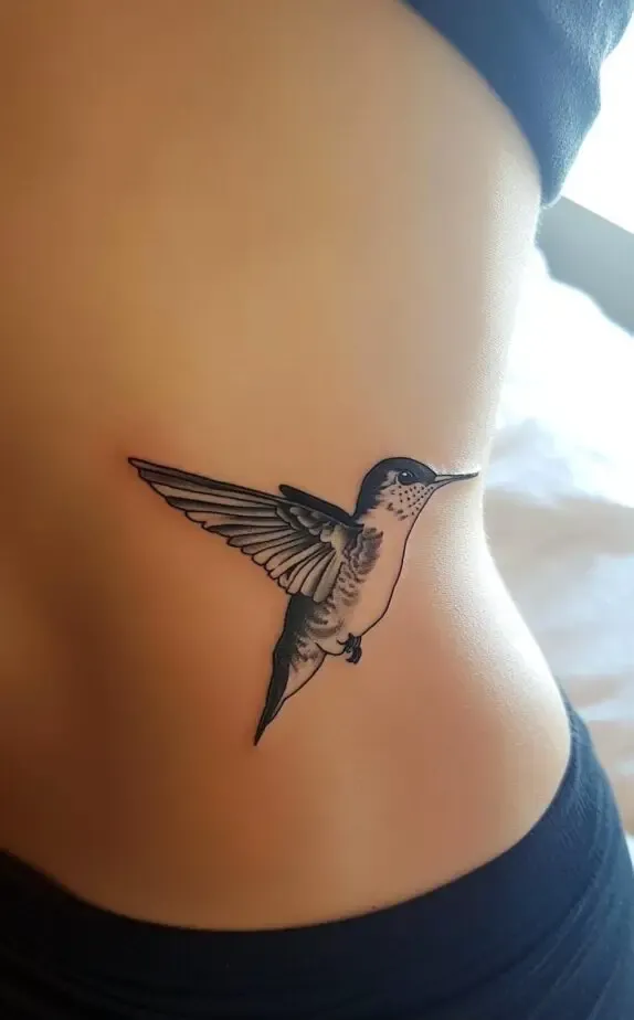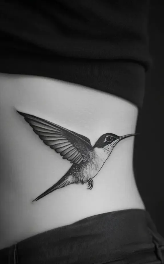 Its black-and-white detailing gives it a modern, minimalist appeal while emphasizing the hummingbird s elegance. The rib cage placement enhances the design s allure, perfect for those who appreciate subtle art.