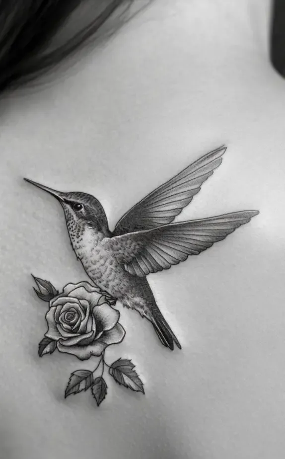 This classic design pairs the hummingbird with a rose, blending symbolism and beauty seamlessly.