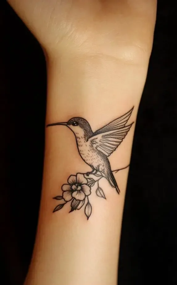 This tattoo features a hummingbird paired with a simple yet elegant floral design.