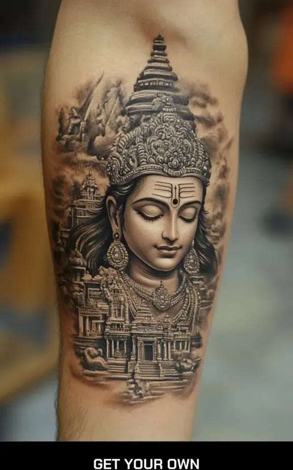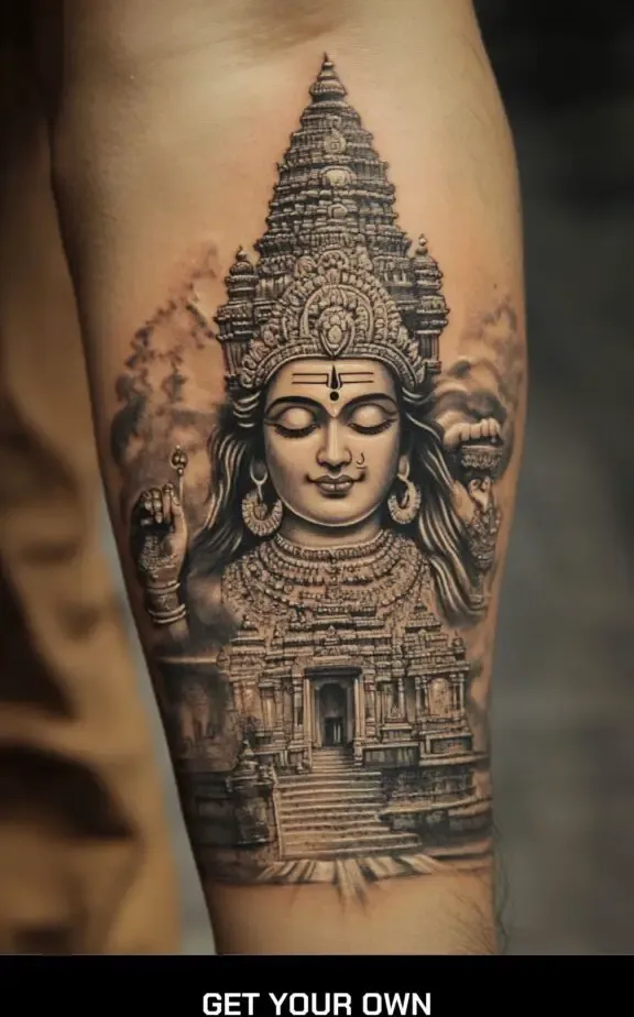 Depicting Shiva along with a temple can represent a sacred space and spiritual devotion. This tattoo can include intricate details of a temple with Shiva s figure or symbols, creating a piece that signifies reverence and sanctity.