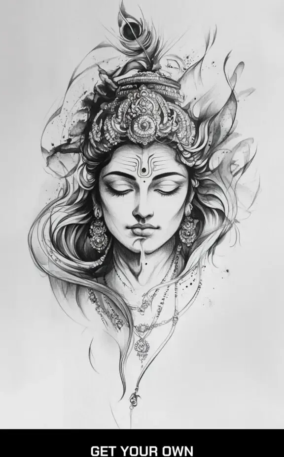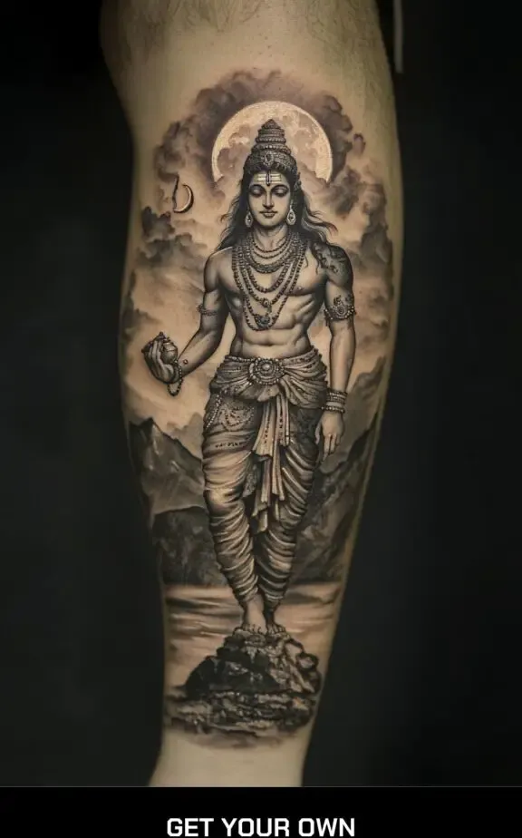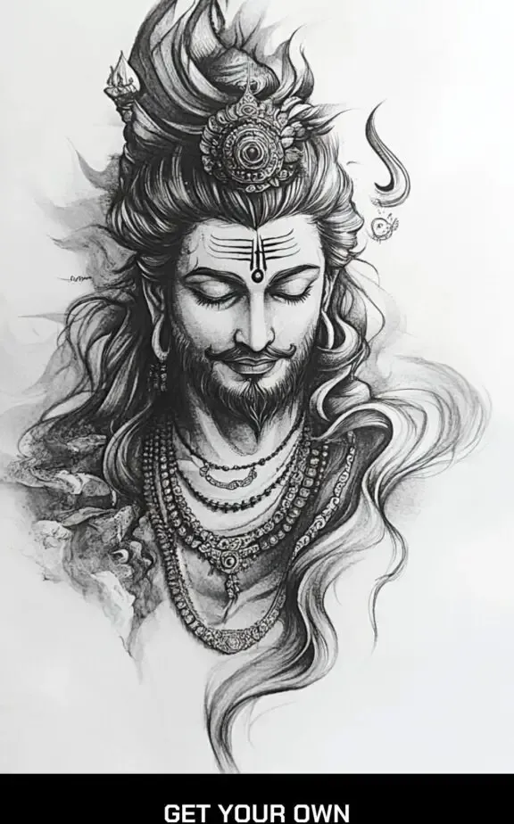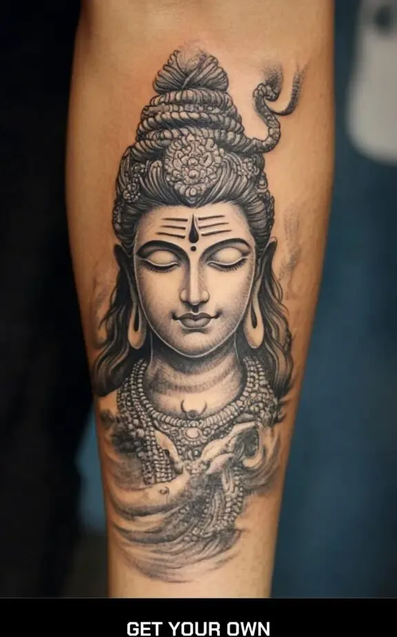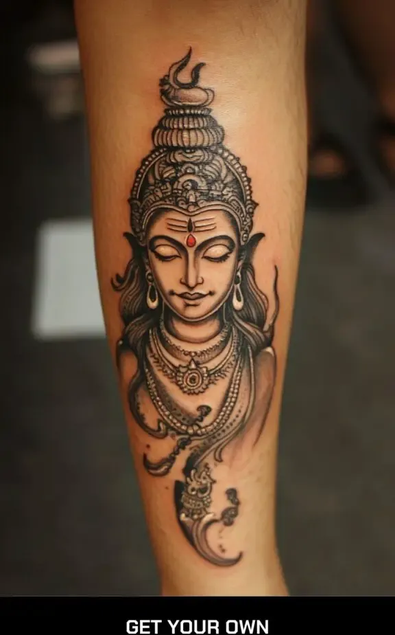 A traditional depiction of Lord Shiva can be a profound piece. This tattoo often includes Shiva s serene face with his third eye open, symbolizing higher consciousness and enlightenment. Accompanying elements such as the crescent moon on his head, the holy river Ganga flowing from his hair, and the snake around his neck can add depth and meaning.