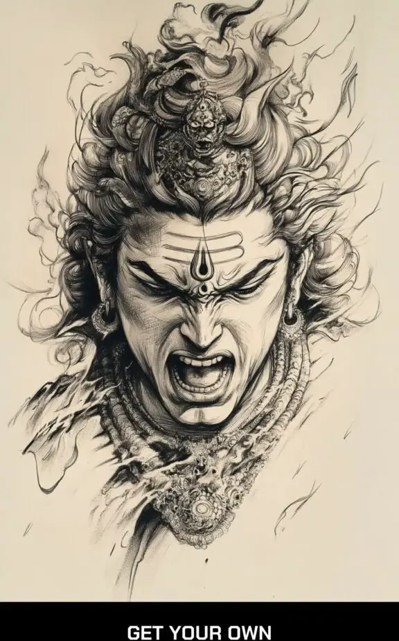 An angry depiction of Lord Shiva, often with his third eye open and flames around, symbolizes his wrath and ability to destroy evil. This tattoo can be a bold and dramatic piece, emphasizing sharp lines and intense expressions to capture his fierce nature.