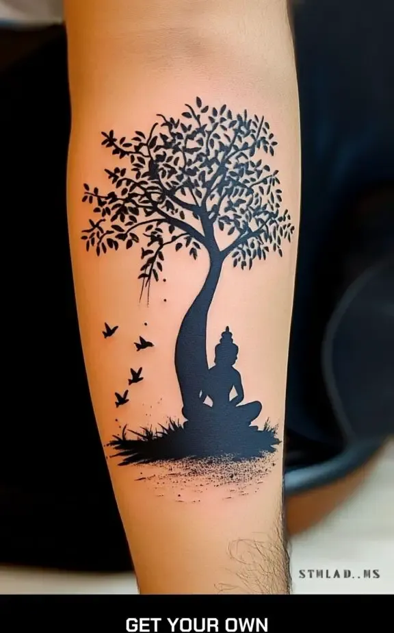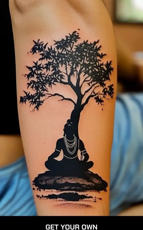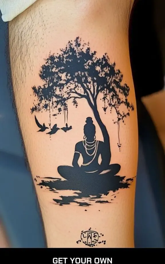 A silhouette tattoo of Shiva can be a striking and artistic choice. The outline of Shiva in a meditative pose or performing the cosmic dance can capture the essence of his divine energy without detailed shading, making it a minimalist yet impactful design.