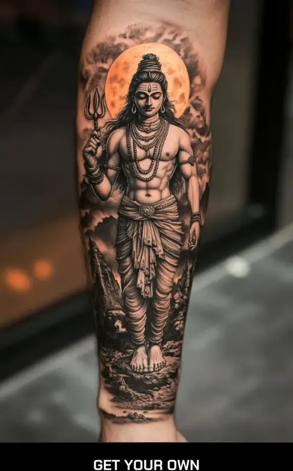 Mahakal, a form of Shiva associated with time and death, is depicted in a more intense and fierce manner. A tattoo of Mahakal can include fierce expressions, detailed work on his trident, and symbolic elements like skulls and flames, representing his power over time and mortality.