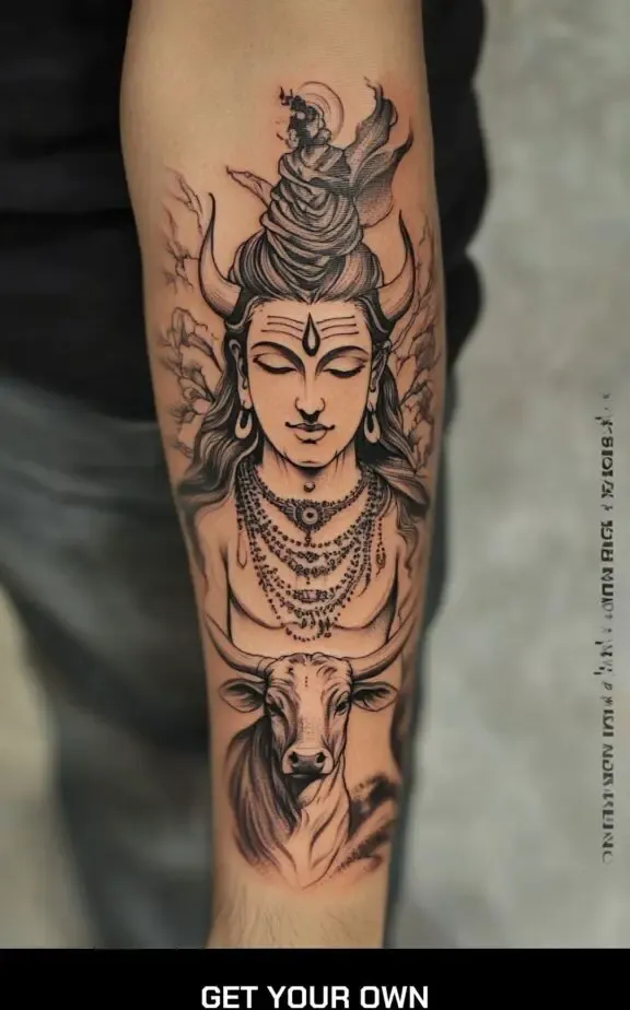 The cow, especially Nandi (Shiva s bull), is a sacred animal in Hinduism, representing purity, strength, and devotion. A tattoo featuring Shiva and Nandi can symbolize loyalty, protection, and the bond between the divine and the devoted.