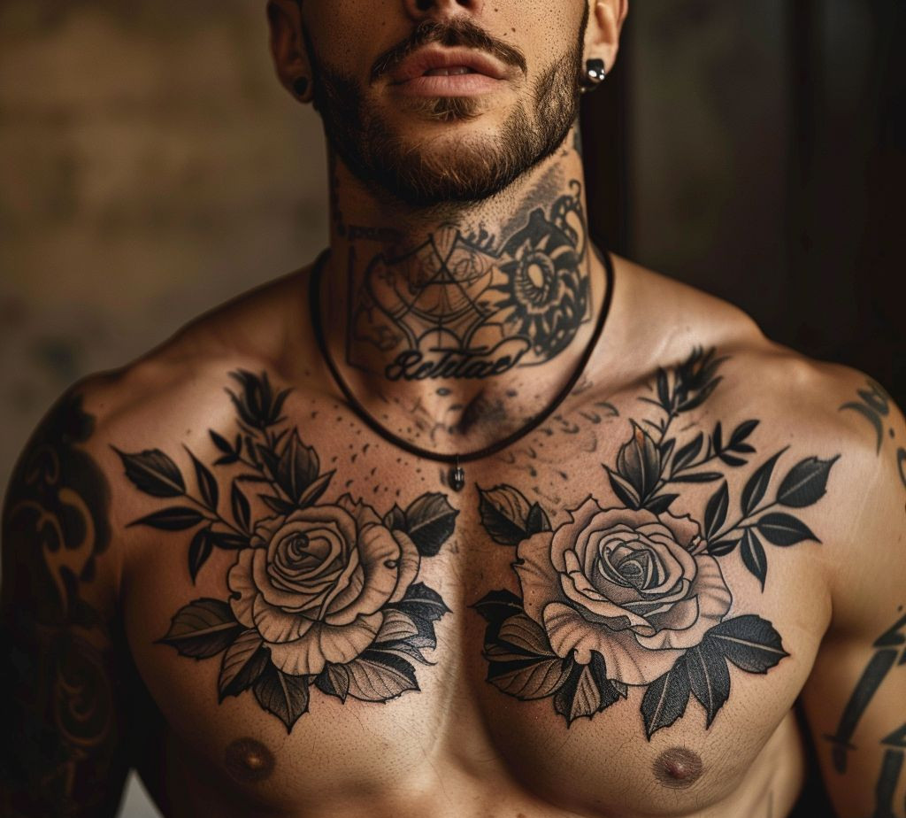 A tattoo that features roses in full bloom across the chest symbolizes a heart full of love and passion.