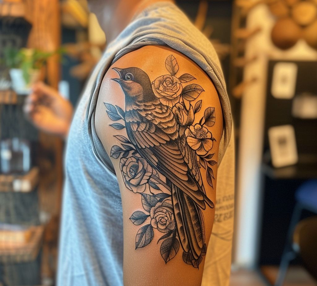 Brightly colored tattoos of birds and roses on the arm could symbolize freedom, beauty, and life s colorful journey. It s perfect for those who embrace vibrancy and movement.