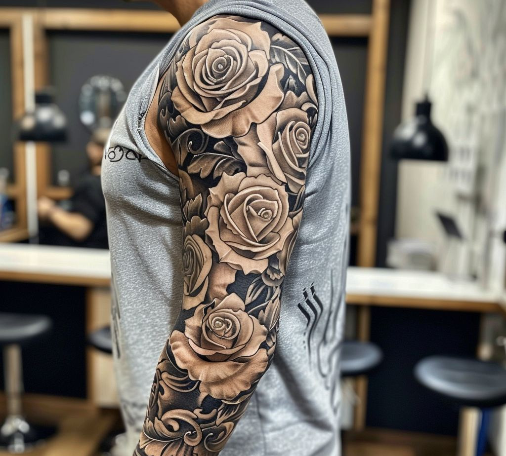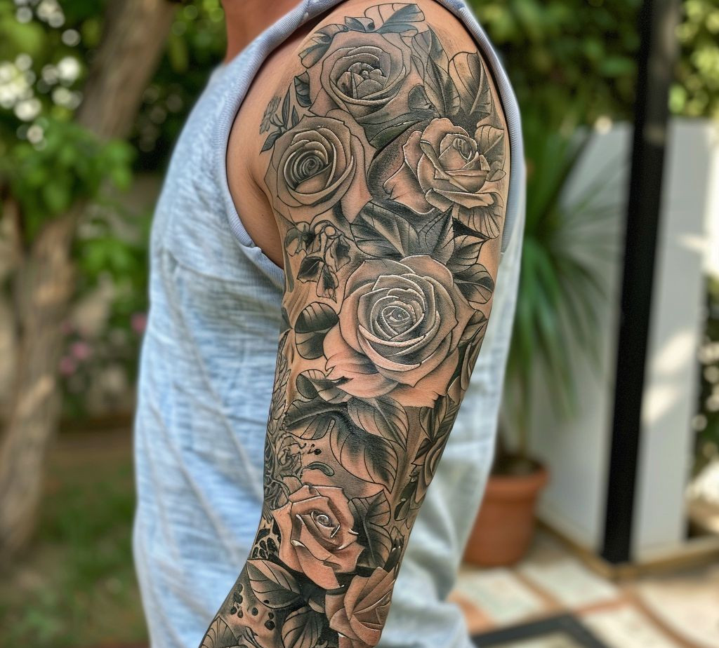 Another full sleeve masculine flower tattoo that incorporates roses among shadows suggests a balance between light and dark in one s life.