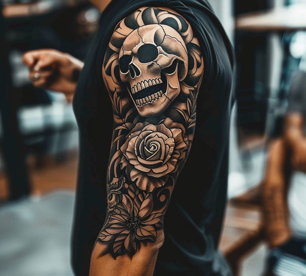 Merging a skull with roses on the arm is a very masculine combination. It symbolizes beauty and the finite nature of existence.