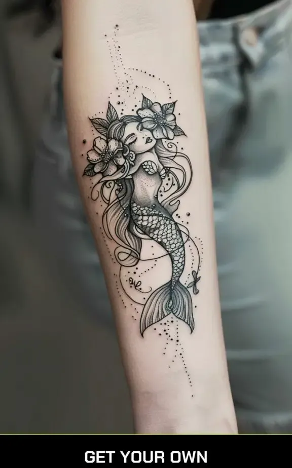 A mermaid intertwined with blooming flowers, symbolizing growth and beauty. This design can be colorful and feminine, perfect for those who love nature and mythical elements.