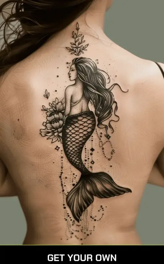 An intricate mermaid design that follows the natural line of the spine, creating a stunning and elegant visual effect.