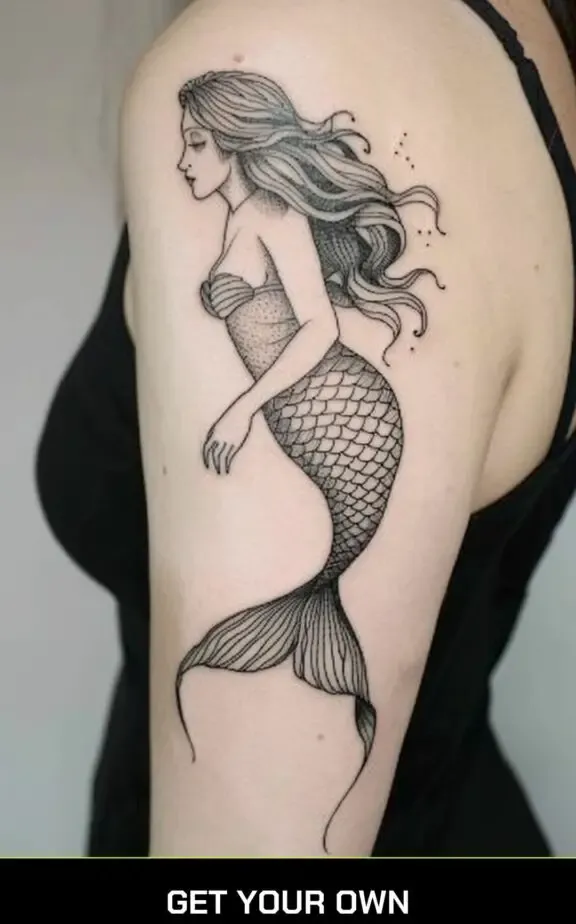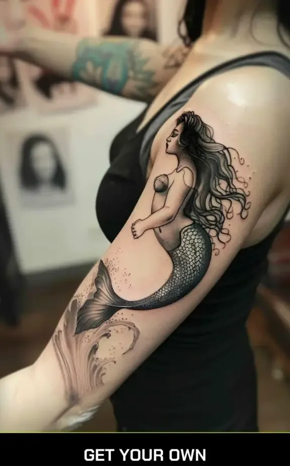 Black and gray tattoos are known for their timeless elegance and detail. A black and gray mermaid tattoo can be incredibly detailed and realistic, capturing the beauty and mystery of the mermaid in shades of black and gray.